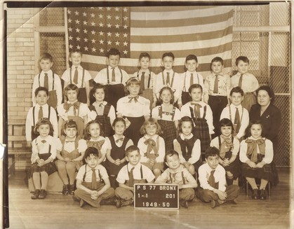 Below is a 1st grade class photo from PS77. How many people can you name? Send to "Contact Us" the names of those you can identify. Hint: Can you find Sandy Morganstein, Mike Moskoff, Flo Miller, Helene Goldberg, Toby Nudelman, Frances Gruber, Ralph Solimano and Gus LaRocca? Who else is in the picture?